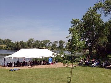 Church congregants gathered beneath a tent at the shore of Mountain Lake, near the boat landing, to celebrate the baptism of Danielle Joleen Duerksen, daughter of Troy and Dixie Duerksen and Katherine Ann Hofmann and Victoria Kay Hofmann, daughters of Perry and Cheryl Hofmann, as well as the infant dedication of Theodore Andrew Nickel, son of Andy and Sara Nickel of Mountain Lake. Pastor Galen Kauffman officiated at the special ceremonies.