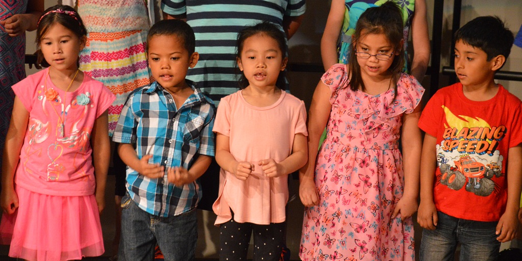 CELEBRATING THE UNITED States and the 50 stars on the American flag with the song, “Twinkle, Twinkle 50 Stars,” are Kindergarten students, from left, Gabriella Parent, Makai’ Vannabouathong, Teairra Savanh, Tryona Khounsanthone, and Angel Fentanez.