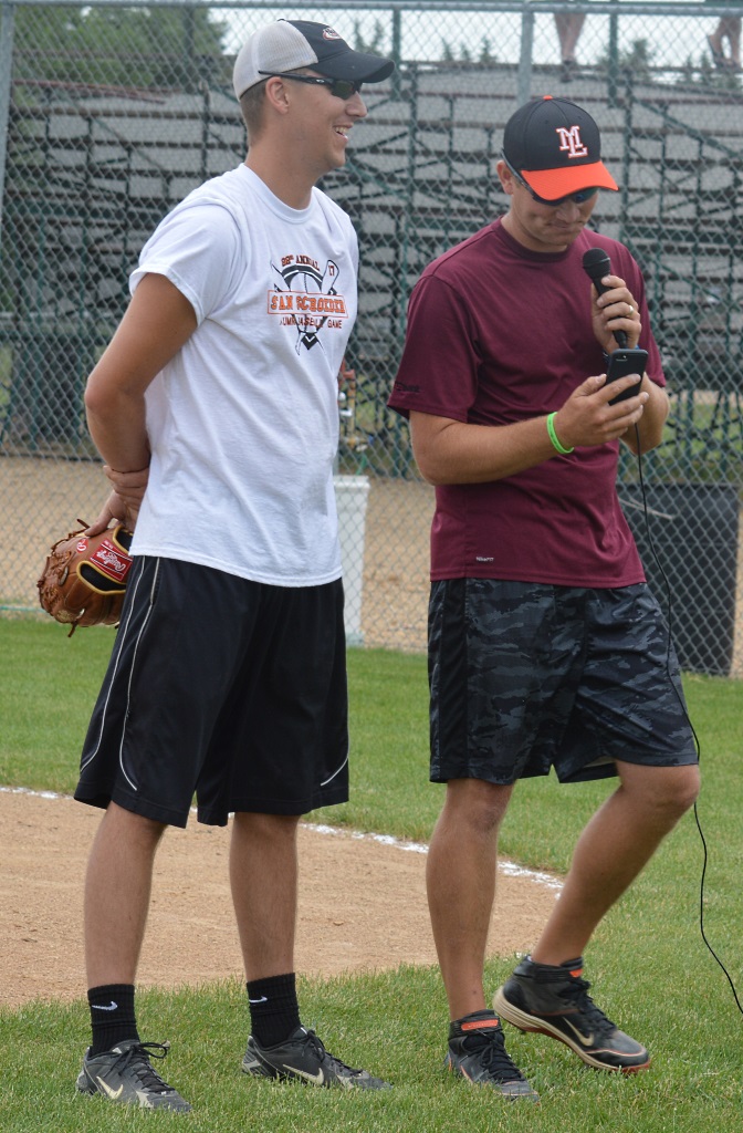 TWO OF THE late Stan “Stan-The-Man” Schroeder’s sons, Adam, right and Mitch, left, honored their dad with remarks prior to the start of the game. They recognized a memorial bench recently installed at the ballfield saluting their dad, presented by the Oeltjenbruns Family. They also noted the renaming of the annual contest to the Stan Schroeder Memorial Alumni Baseball Game. Stated Adam, “After dad passed away, we discovered drawings and plans in his office for the future of the ballfields, along with contact information. To our family, this field is a piece of my dad.” Also speaking was Mountain Lake Public School Superintendent Bill Strom, who shared about the devoted work Stan put into rejuvenating the baseball and softball fields at Munson Field, carrying on the legacy of his late father, Bob Schroeder, who spearheaded the original reconstruction of the athletic field area. Missing was the third Schroeder brother, Kyle, who was participating in a friend’s wedding. For a link to an article about Stan’s special bench, go to: https://www.cross-countiesconnect.com/2017/06/devoted-diamond-duty/