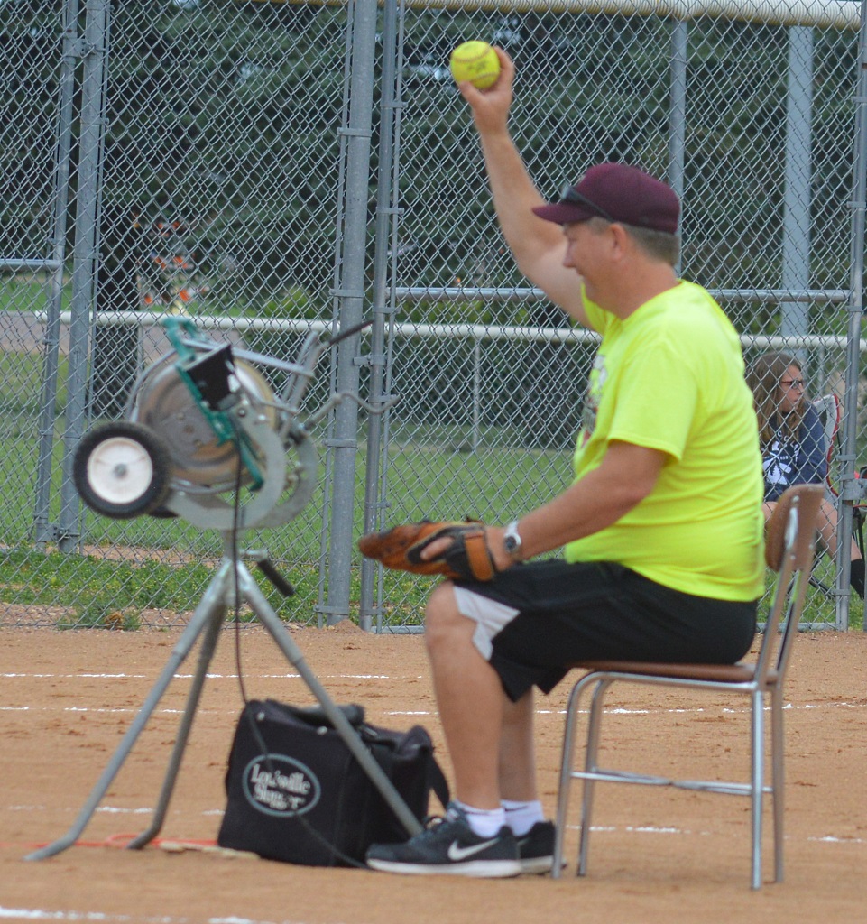 DESIGNATED PITCHER FOR both teams was the pitching machine, assisted by Shawn Naas.