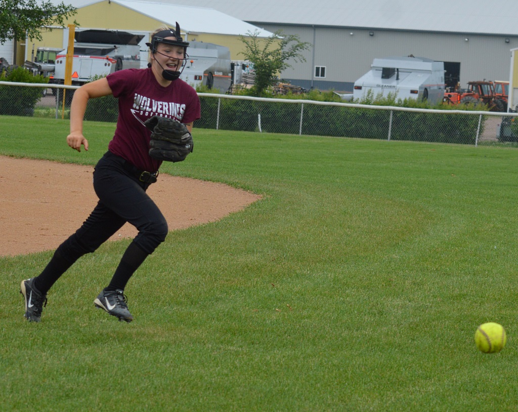 AN APPROPRIATE PHOTO ala “Field of Dreams – baseball played on a rural diamond, with green growing corn and a grain elevator as the backdrop. Team Steve Schroeder’s third-base player Eli Karschnik, runs in to nab the slow roller. At back are second-base player Kyle Ott, left and right-fielder Levi Jahnke, right.