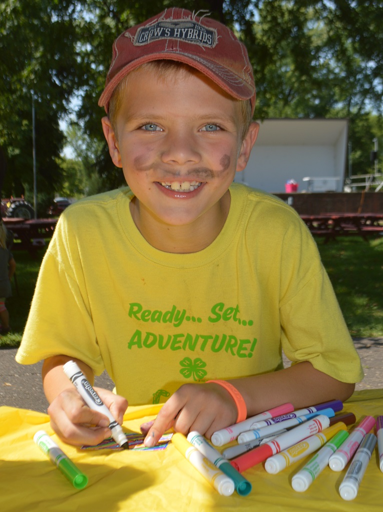 BRAXTON BROWN (IN case you didn’t recognize him with his mustache disguise) works on a name tag at a booth sponsored by Fulda Area Credit Union-Mountain Lake Branch.