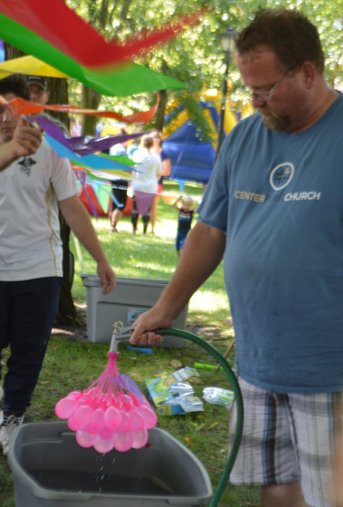 CENTER POINT VOLUNTEER David Korns, right, makes quick work in filling balloons for the Water Fight with this attachment.