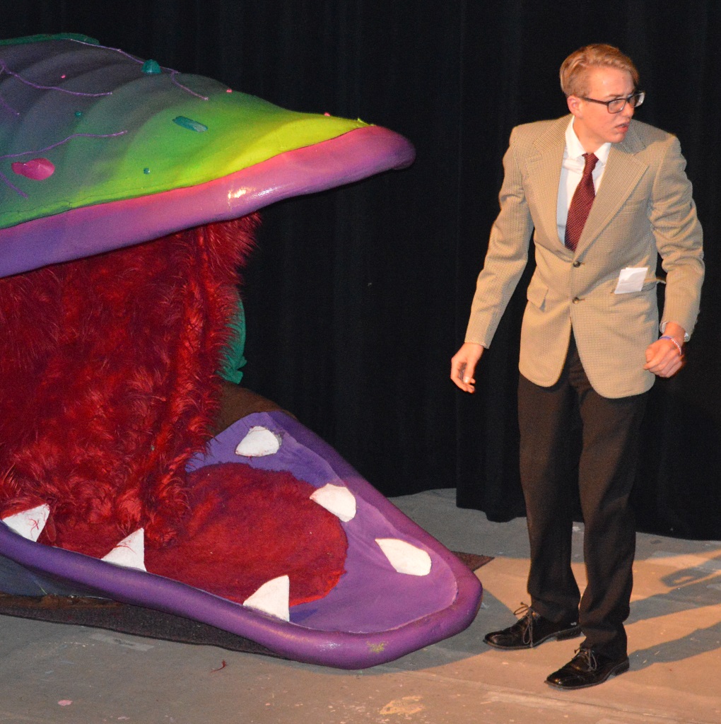 The Doo-Wop Girls (Amy Bartsch, Jae Faber, Kyla Perkins, and Kayla Vonk) lead audiences through this story about nerdy and meek floral assistant Seymour Krelborn (David Hall), who pines for his co-worker, Audrey (Chloe Klassen). They both work in a down-and-out flower shop on Skid Row owned by Mr. Mushnik (Paton Buller). During a total eclipse, Seymour finds an unusual plant he decides to call Audrey II (the voice of Audrey II is played by Joey Baldone) But . . . the rock-and-blues-singing carnivore promises unending fame and fortune to Seymour – as long as he keeps feeding it blood. The plant attracts a lot of business for the Flower Shop. After the accidental death of Audrey’s boyfriend, Orin Scrivello, D. D. S. (Regan Syverson), Seymour feeds him to the plant (plant puppeteers are Taylor Hudson, Seth Klassen, Michael Watkins and Maleek Stewart) and must continue to come up with similar meals for this bloodthirsty plant. Over time, though, Seymour discovers Audrey II’s out of this world origins and intent towards global domination